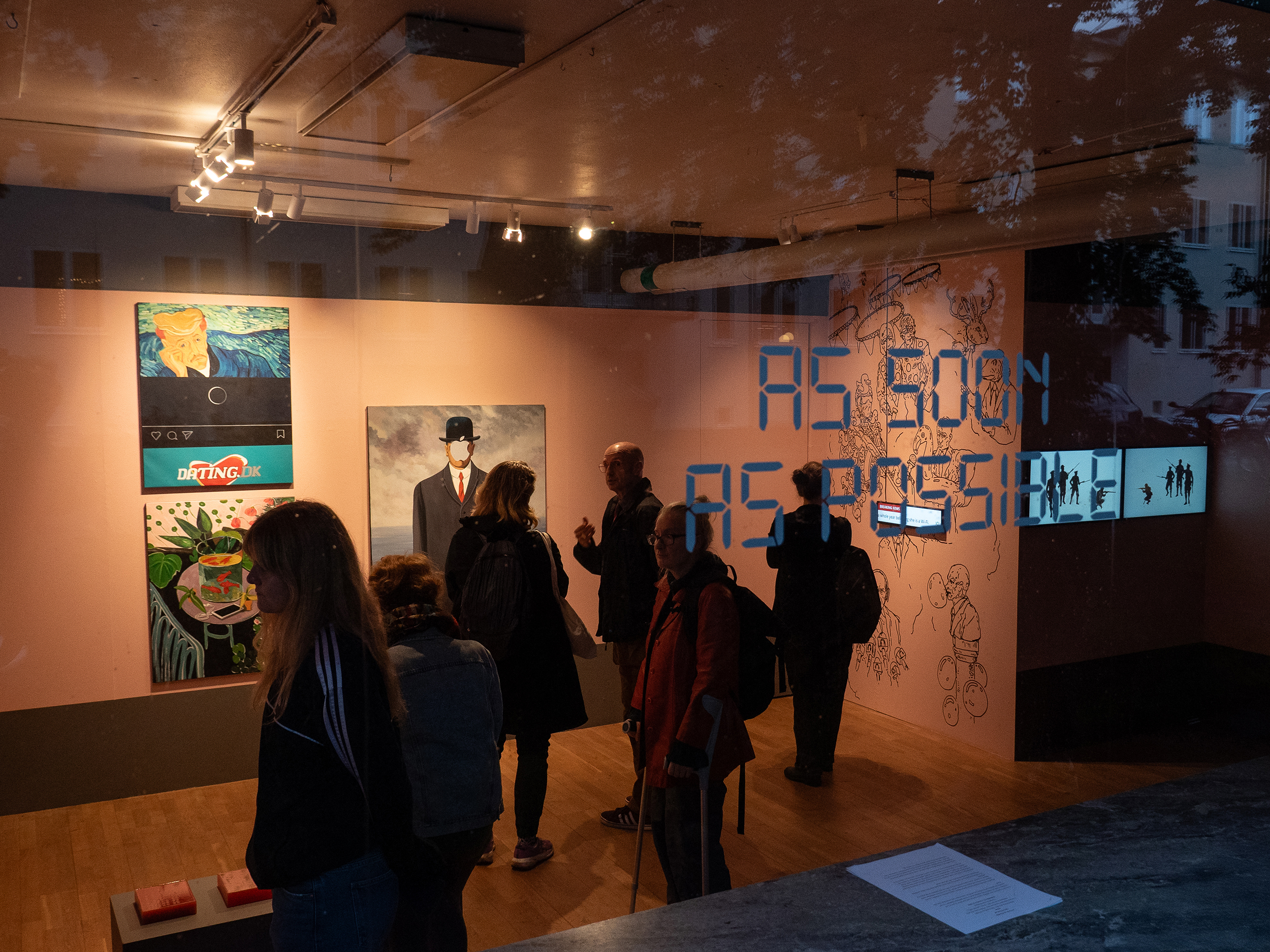 Vi tar del av Mafunes berättelse när hon visar oss utställningen Mend of Absence med glasskulpturer som klättrar på väggar och mellan varandra. Som staplas på varandra och som berättar om motståndskraft, skuggor och ljus. En installation i fönstret skapad av tejpbitar grenar ut sig och kastar skuggor på övriga verk under dagtid. Men inte just nu, mörkret har redan lagt sig. Vi avslutar med att titta på utställningen As Soon As Possible, som Abir curerat på AllArtNow. En grupputställning som pratar om världens parallella rytmer; en alltmer accelererande tillvaro, planetens långsamma förstörelse, militarisering och en oändlig nyhetsloop med globala konflikter. Vi bryter upp och tackar Abir och Mafune för det generösa delandet.
