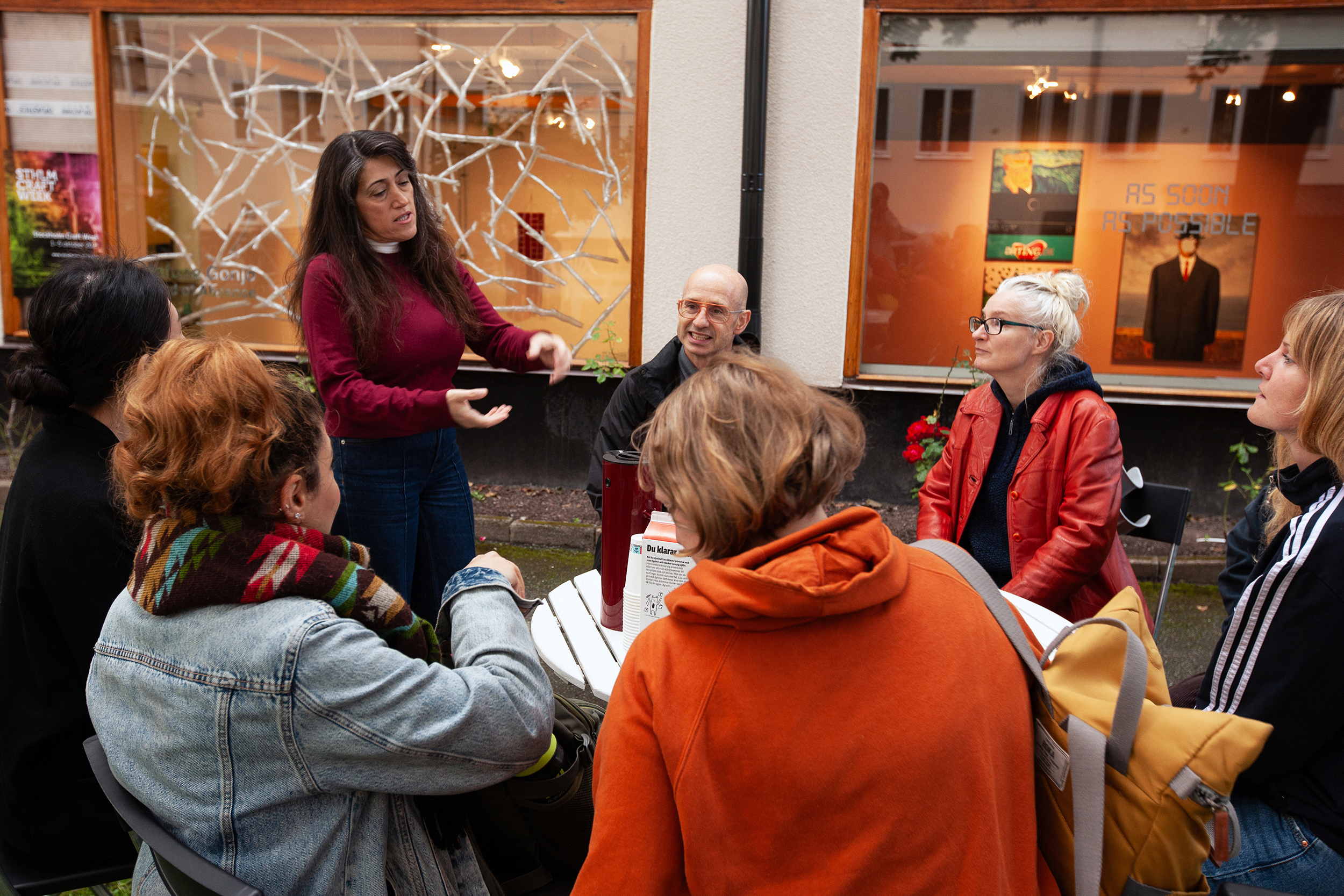 Vi är nio personer som genom Konstnärscentrums projekt KnowHow samlats för att höra Abir berätta om hur hon, som drev galleri i Damaskus, skulle komma att landa i Hjorthagen. Konstnären Mafune Gonjo finns också på plats. Vi är nyfikna på att höra mer om hennes praktik, som rört sig från Japan till Sverige. Vi vill se hennes nya arbeten som visas på Extension Art Space och gärna höra mer om hur Mafunes och Abirs samarbete har sett ut.