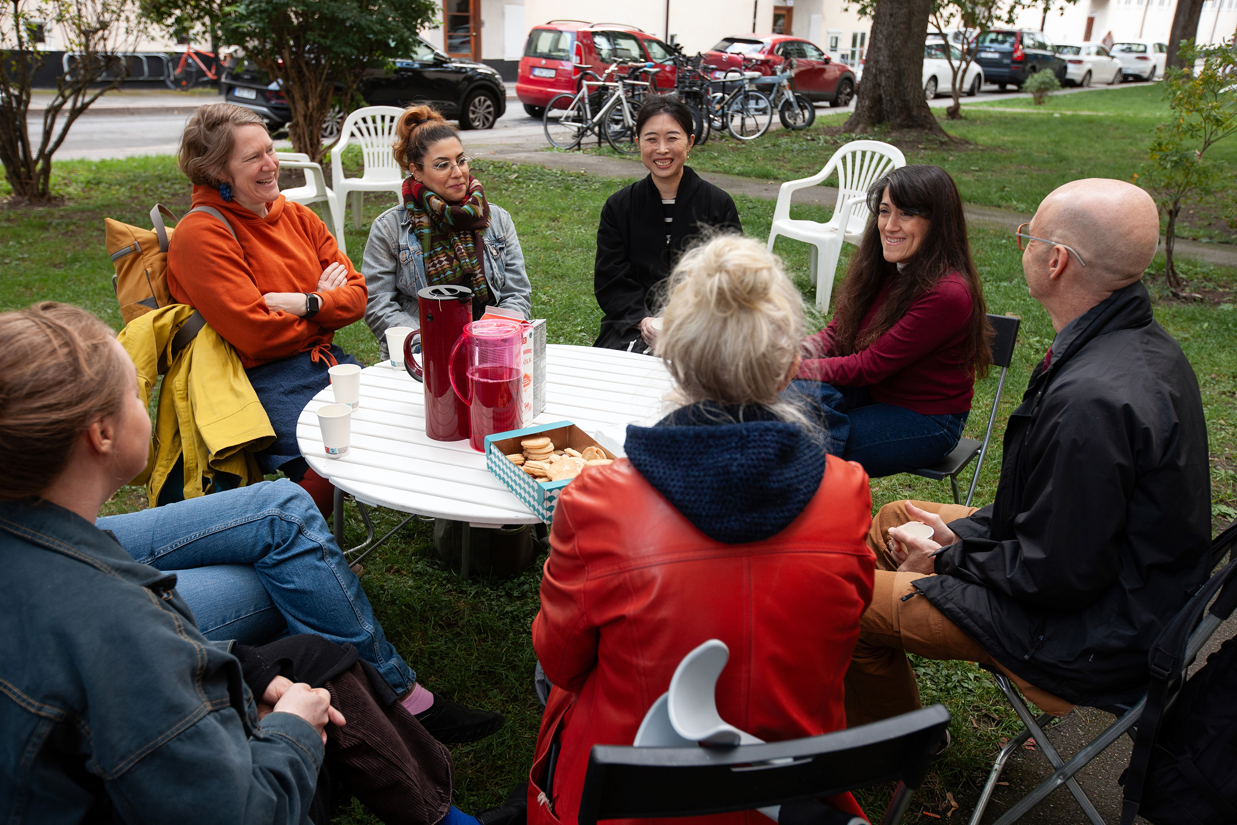 It’s a mild afternoon in late September. We are sitting around a table on the grass outside AllArtNow and Extension Art Space. The galleries are next to each other on the ground floor of a 1930s functionalist building in Hjorthagen, in the northeast part of central Stockholm.