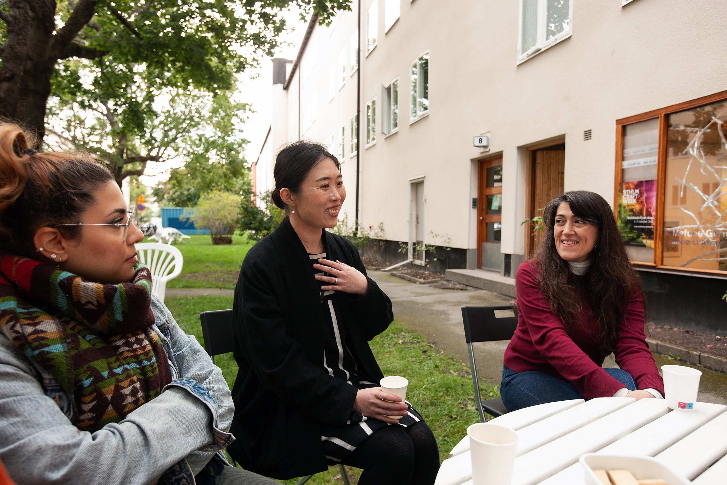 “Please, help yourself,” she says with a smile. “I used to offer both coffee and some sweets, but now I heard that people in Sweden prefer to serve themselves.” We smile in recognition.