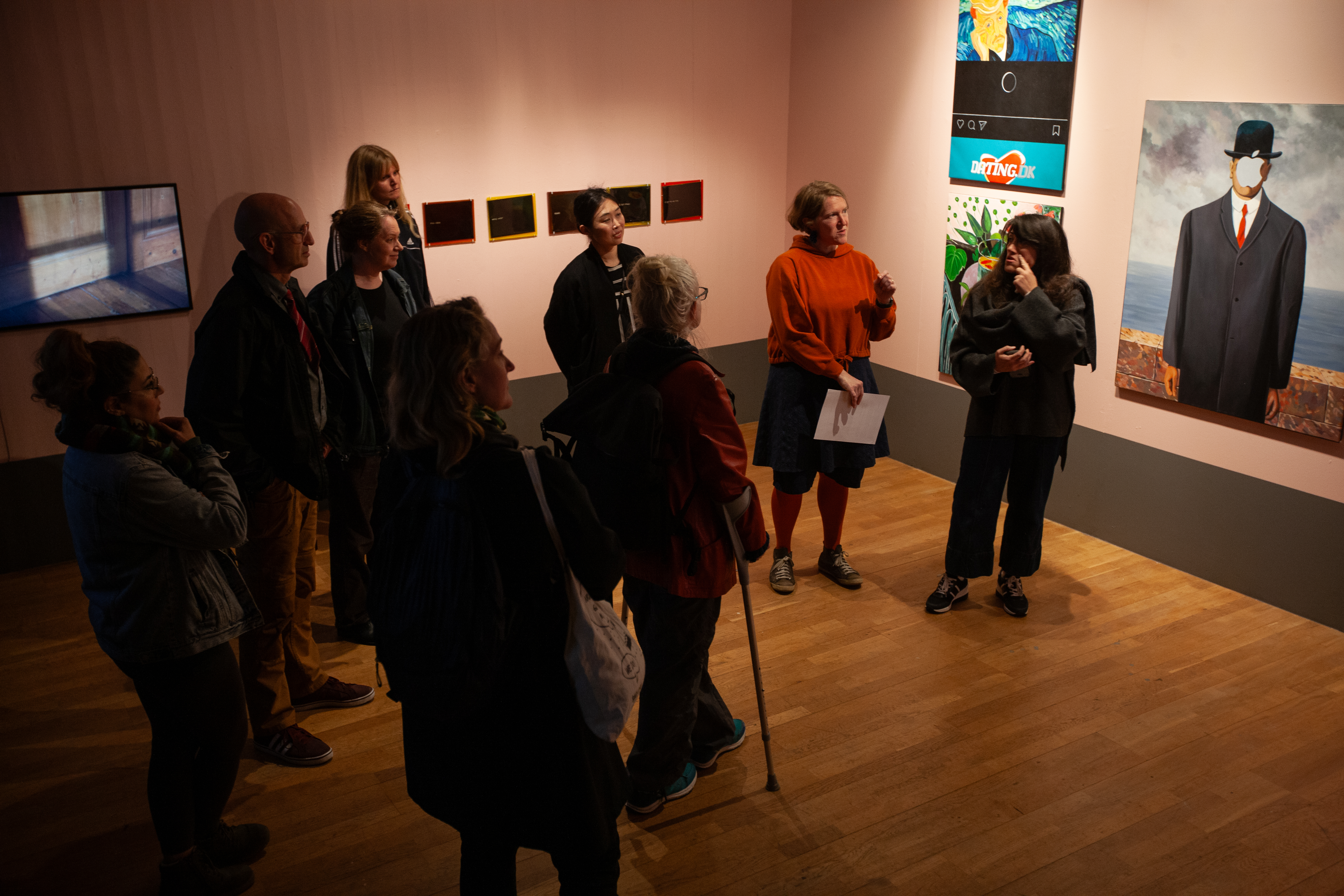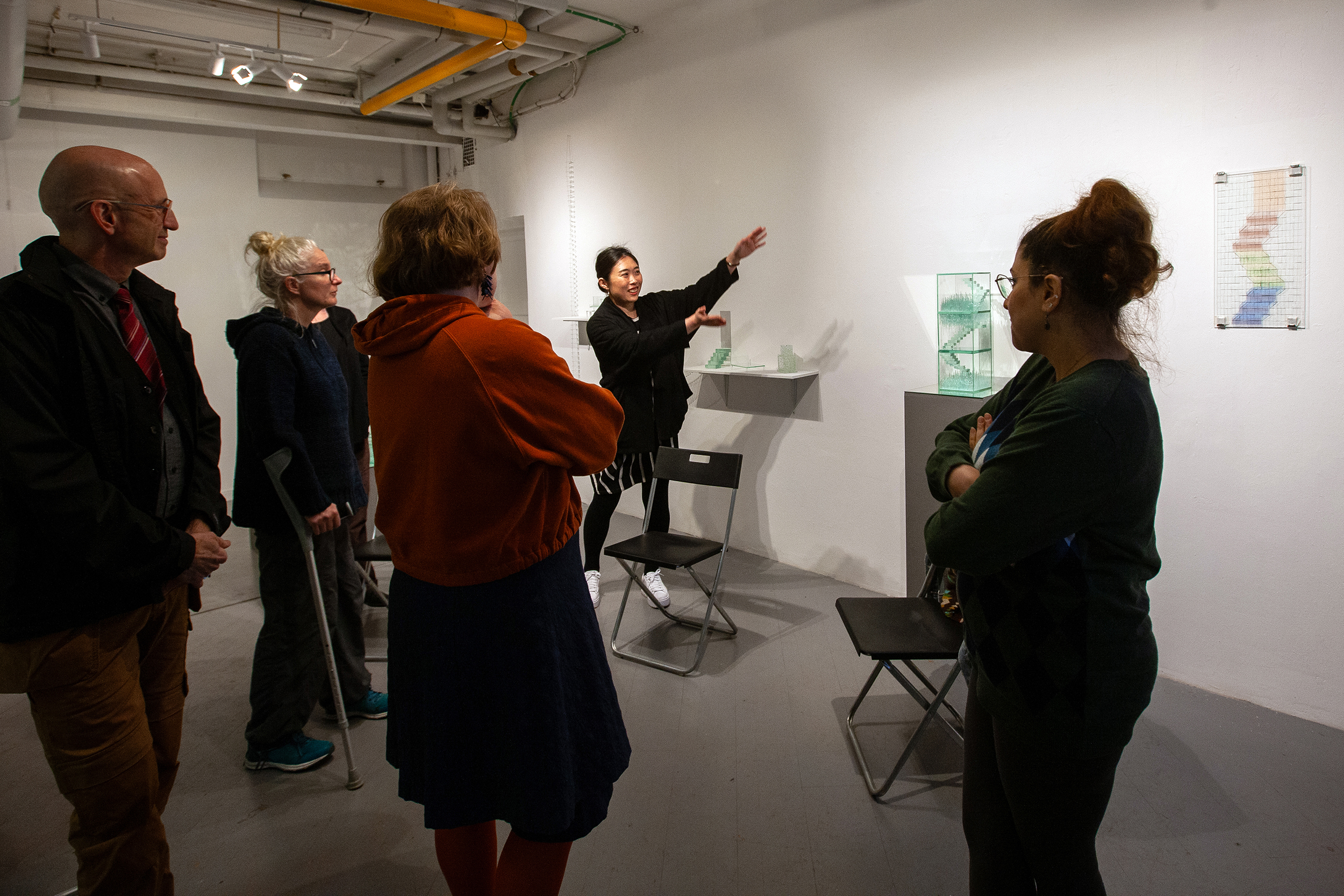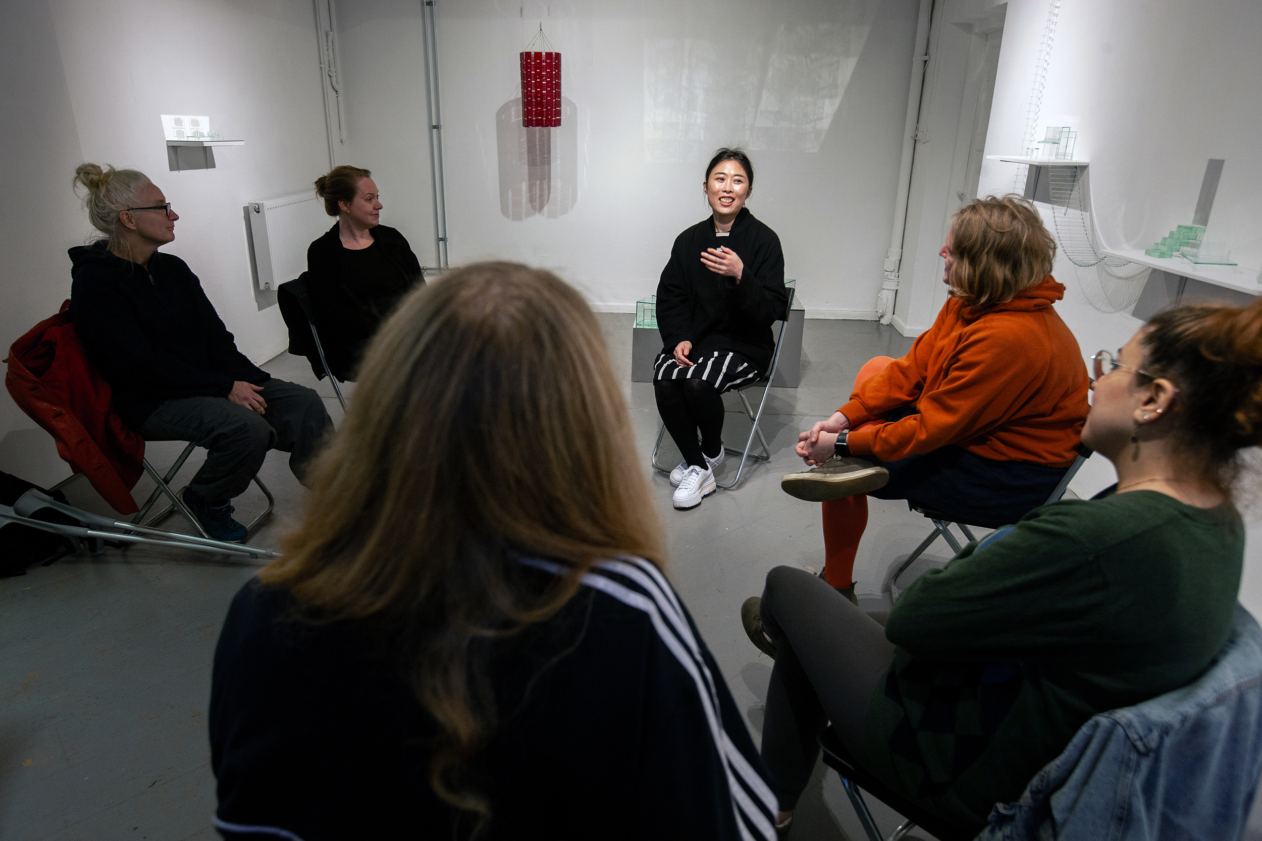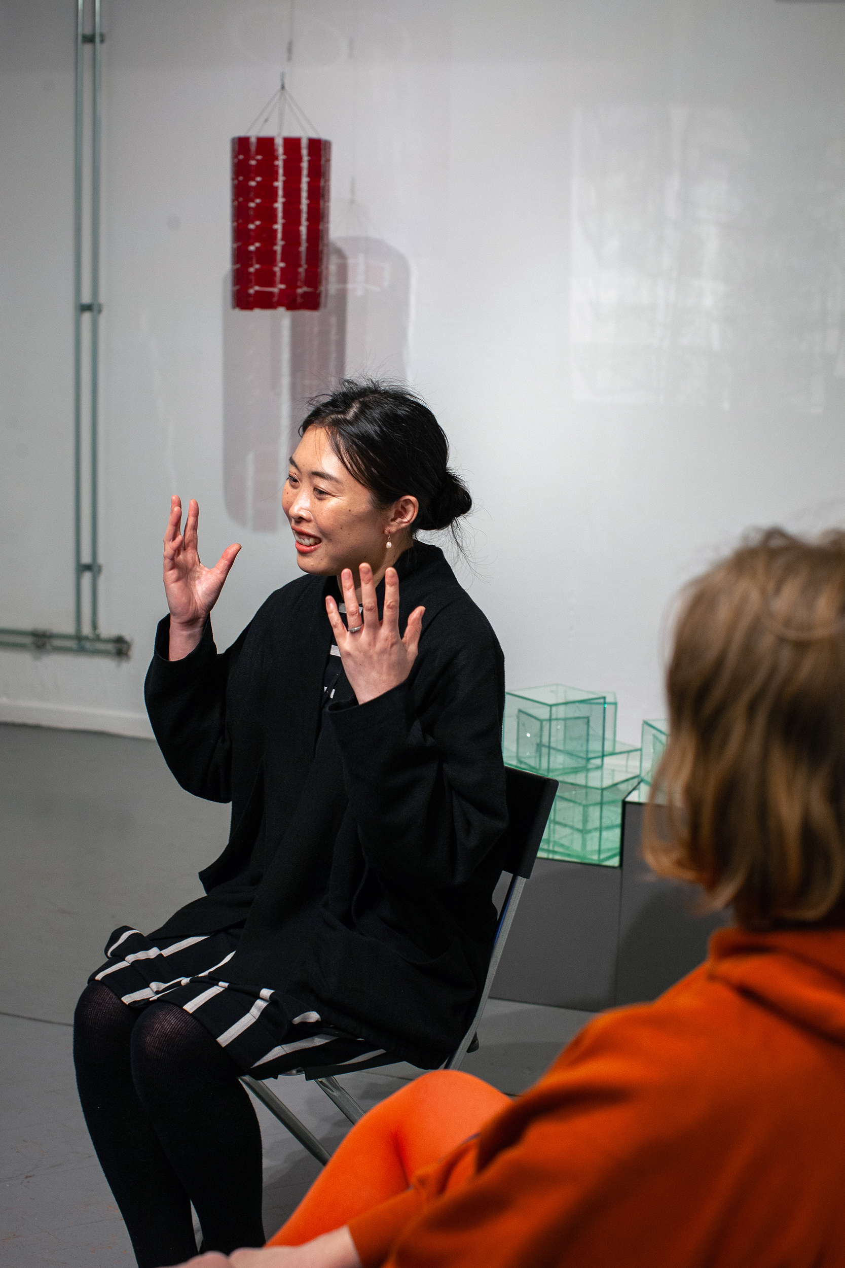 We take part in Mafune's story when she shows us the exhibition Mend of Absence with glass sculptures that climb walls and between each other. Which are stacked on top of each other, and which tell of resilience, shadows and light. An installation in the window created from pieces of tape branches out and casts shadows on the other works during the day. But not right now, the darkness has already fallen. We finish our visit by looking at the exhibition As Soon As Possible, which Abir has curated at AllArtNow. A group exhibition that talks about the world’s parallel rhythms — our accelerating lives, the slow destruction of the planet, militarization, and an endless news loop of global conflicts. We end the evening by thanking Abir and Mafune for generously sharing their inspiring stories.